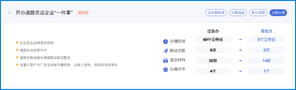 “开办道路货运企业一件事”是国务院确定的2024年“高效办成一件事”的重点事项之一,适用于道路货物运输经营业户(危险货物道路运输经营、使用总质量4500千克及以下普通货运车辆从事普通货物经营的除外)申请“普通货物道路运输经营许可、普通货物运输车辆《道路运输证》配发”四项政务服务事项的联合办理,经营者可一次性提交全部申请材料、交通运输行政审批人员一次性完成两项事项的审批、经营者一次性获取道路运输经营许可证和道路运输证,是进一步提高道路运输政务服务效能,优化营商环境,推动道路运输高质量发展的有效措施。
