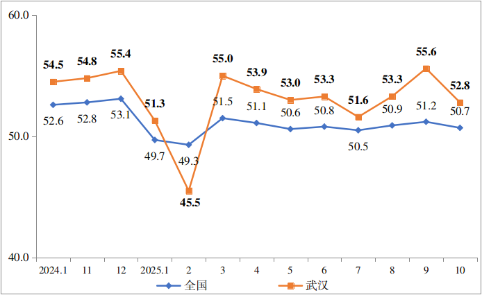 图1 2024年10月-2025年10月全国和武汉物流业景气指数走势图