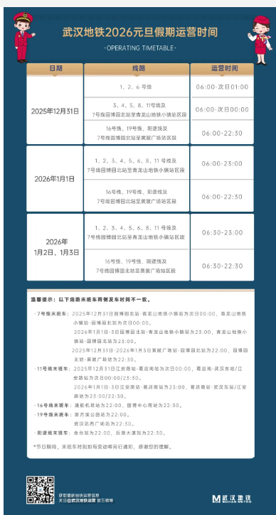 作为疏运主力,轨道交通将实施精准延时与运力加密。12月31日晚,地铁1、2、6号线延时运营2小时,末班车发车时间为次日1时,其中2号线抵达天河机场等地最晚超2时40分,江汉路、循礼门等重点站及光谷有轨电车L1交路运营时间同步延长。同时,地铁3、4、5、7、8、11号线均延时1小时,末班车发车时间为当晚12时。针对客流高峰,重点线路将压缩行车间隔,调整运行交路,并增投晚间运力。