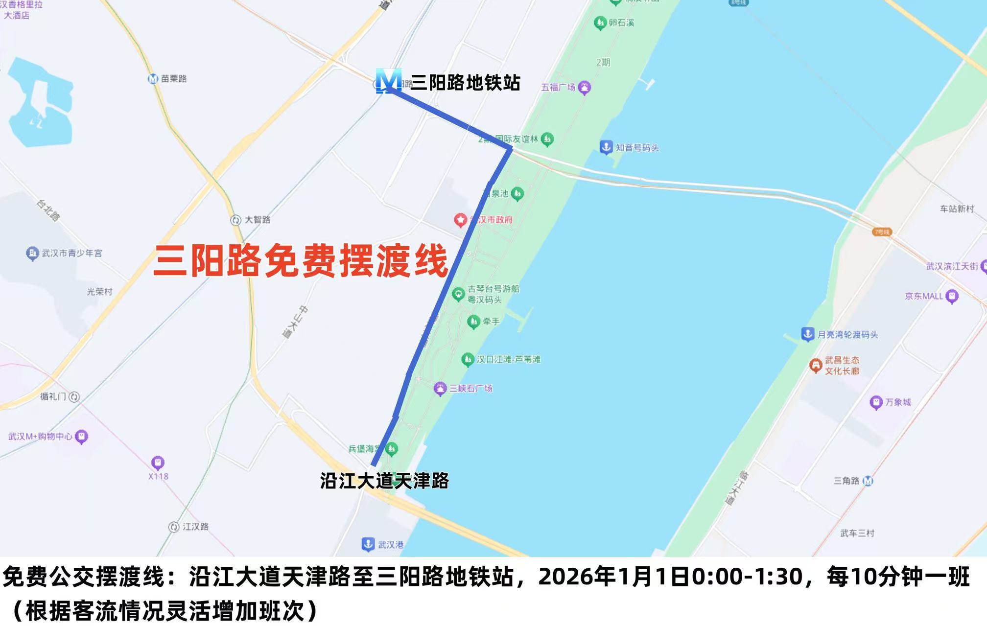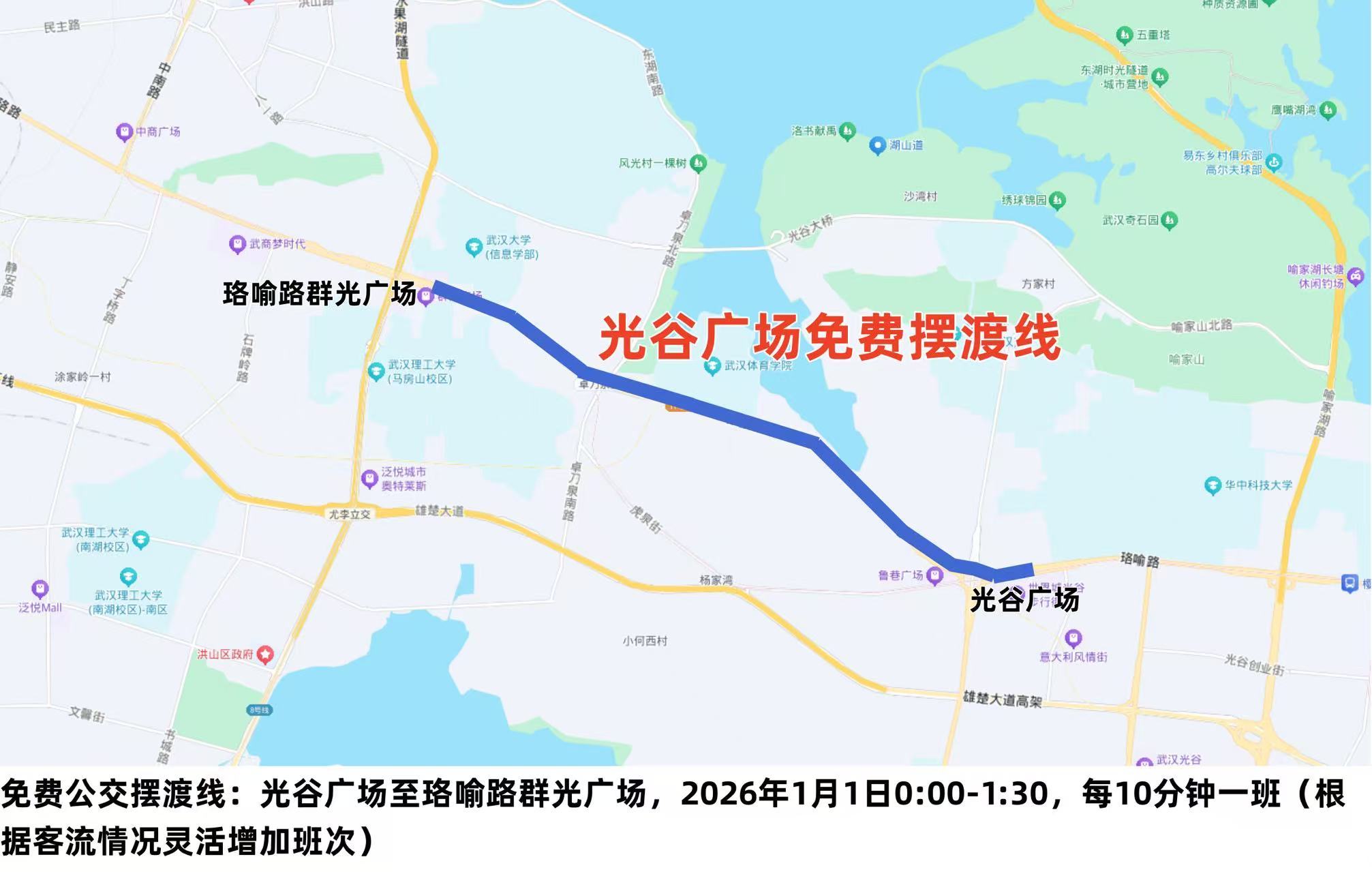 为应对跨年夜零点散场高峰,公交部门开通3条免费摆渡专线,分别在沿江大道民生路至六渡桥地铁站、沿江大道天津路至三阳路地铁站、光谷广场至珞喻路群光广场方向循环摆渡。同时,30台应急疏散公交车提前在江岸段、江汉段等指定区域停候。
