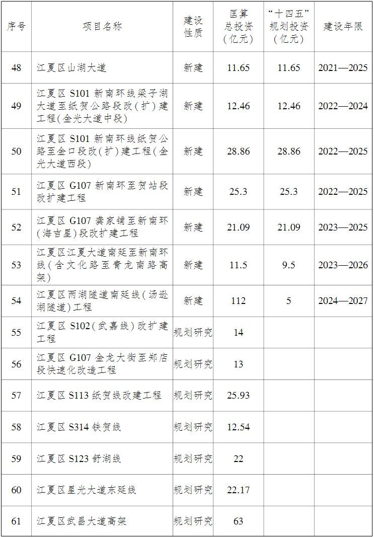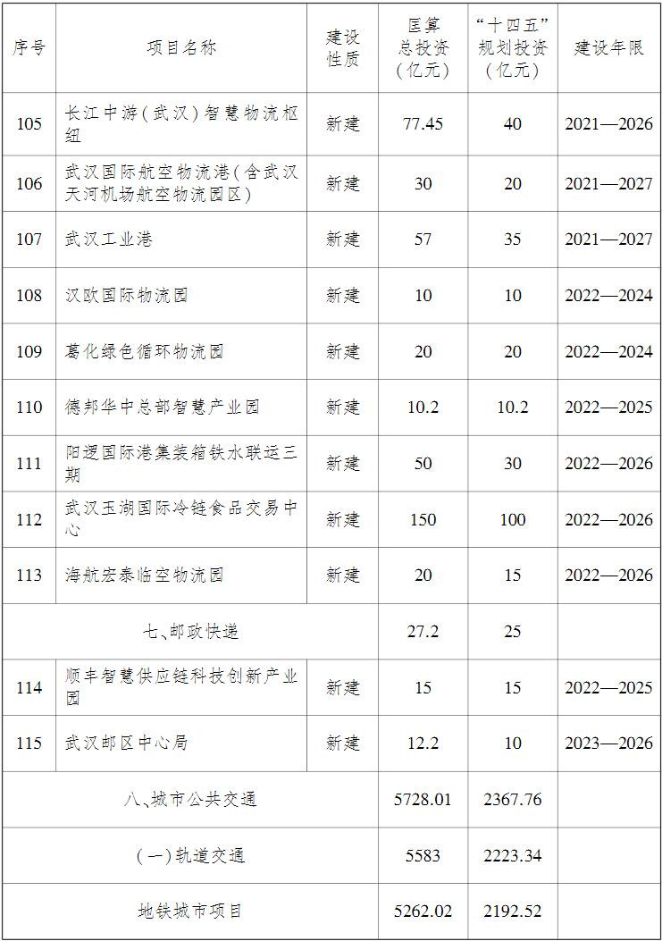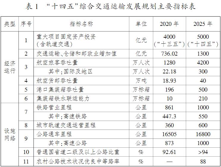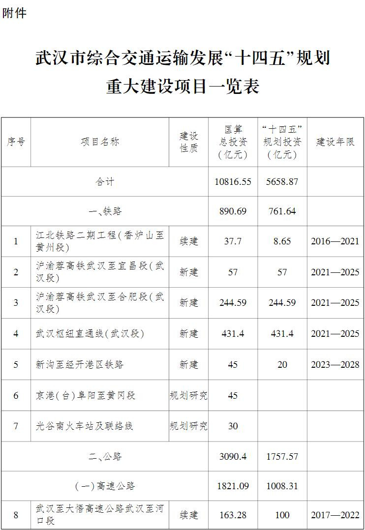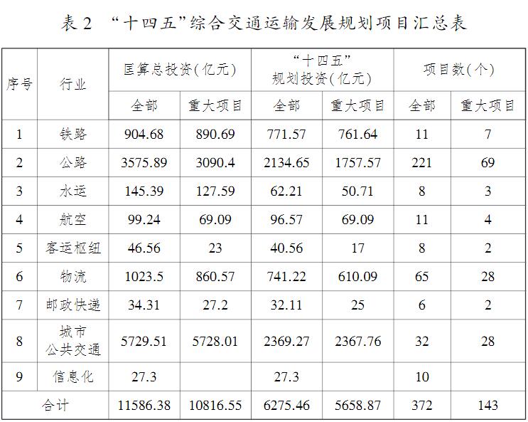 “十四五”时期,全市综合交通运输项目分为铁路、公路、水运、航空、客运枢纽、物流、邮政快递、城市公共交通、信息化等9大类,共计372个项目,规划总投资约11586亿元,“十四五”规划完成投资约6275亿元。其中,重大项目(总投资在10亿元以上的项目,见附件)143个,规划总投资约10817亿元,“十四五”规划完成投资约5659亿元。