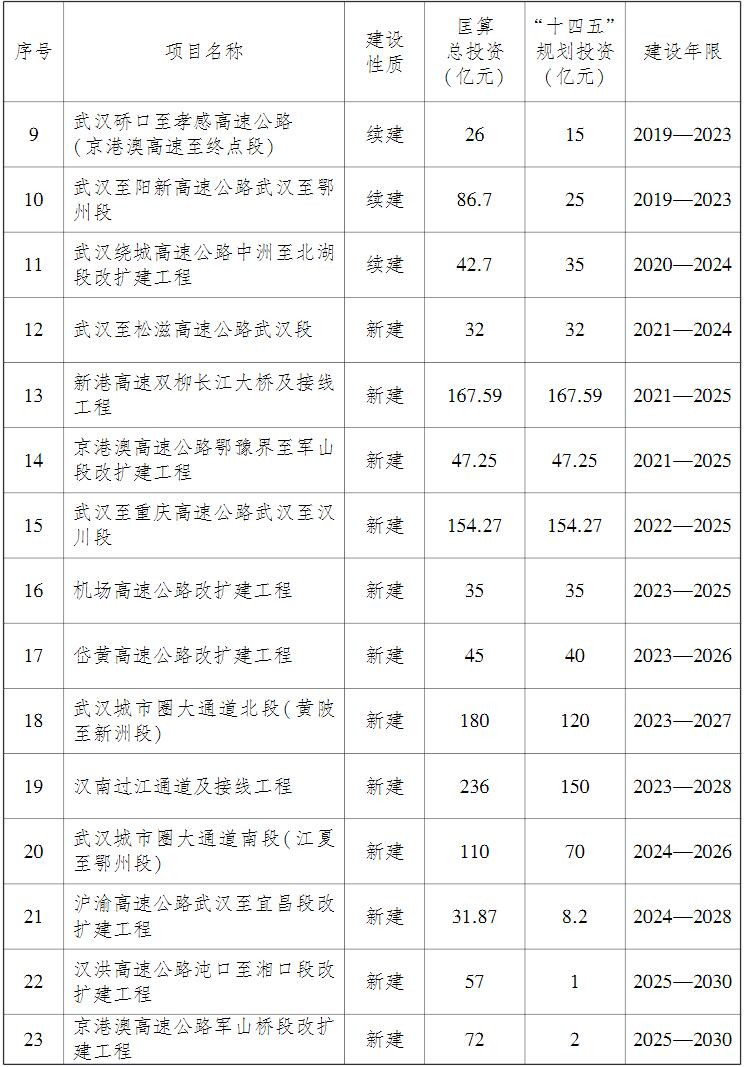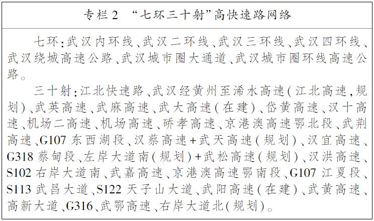 1.强化城市圈高速公路直联直通。建设武汉城市圈大通道和武汉至周边城市射线,实施京港澳高速武汉段、沪渝高速武汉至黄石段改扩建,新建武汉至天门、武汉至松滋高速,推进武汉经黄州至浠水高速、硚孝高速延长线、岱黄高速改扩建等项目前期工作,谋划形成以武汉为中心、辐射城市圈的“七环三十射”高快速路网络,实现武汉至周边城市的直联直通直达。加密高速出口,实施近城地区高速公路互通、收费站扩能改造,缓解进出城通道常态性拥堵。提升高速公路服务区综合功能,向交通、生态、旅游、消费和物流等复合功能服务区转型升级。