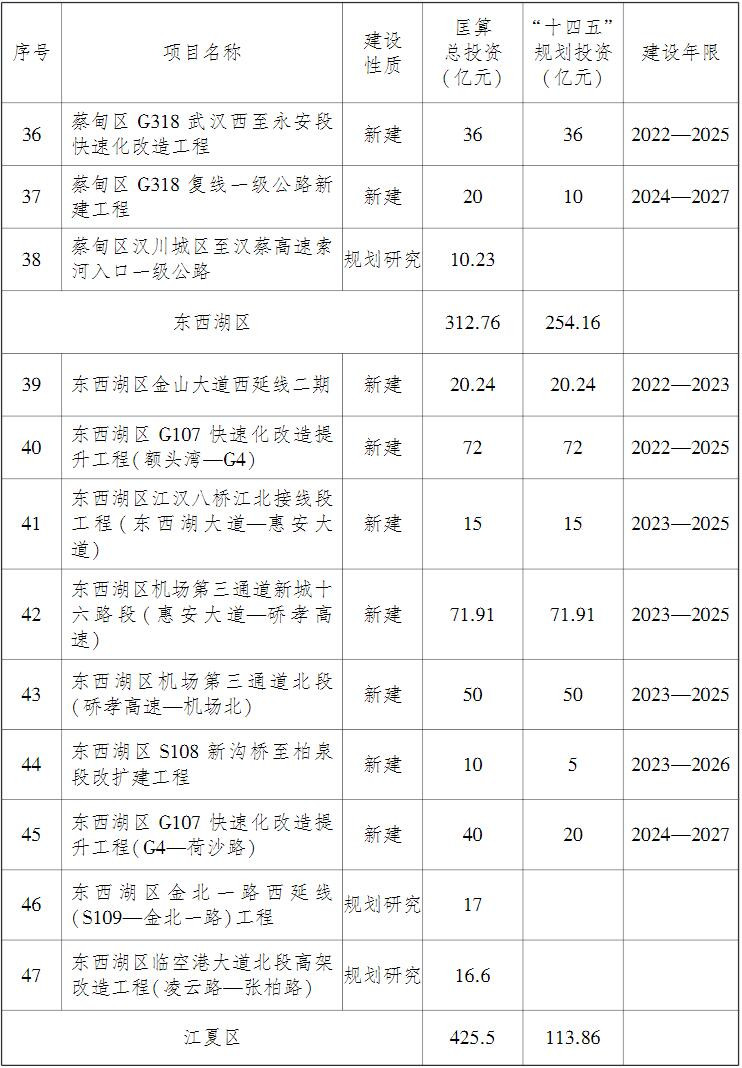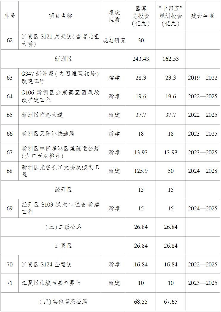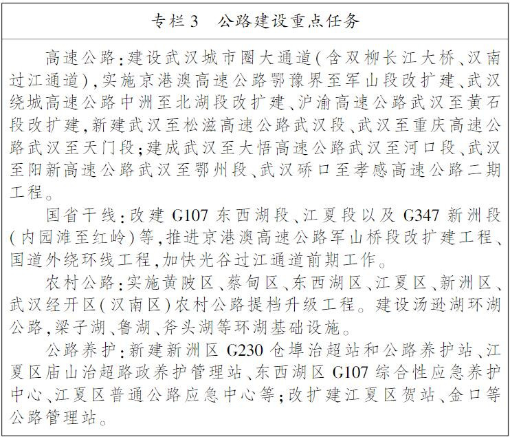 2.加快普通国省道提质升级。推进国省干线达标提质,加快待贯通路段建设,推进二级及以下低等级路段改造,实施G107、G318、G106改建项目。结合城市发展和环线布局,谋划国道外迁形成新的环射格局,加快光谷、车谷等副城新增过江通道前期工作。完善市内公路与城市道路衔接,实施城市对外通道、重要城镇过境段公路、大型货运枢纽集疏运通道快速化改造,加强主城区和新城区道路联通,缓解通行能力不足造成的城市交通拥堵。加强黄陂、新洲区等与大别山革命老区红色旅游资源衔接的公路建设,促进区域协同发展。