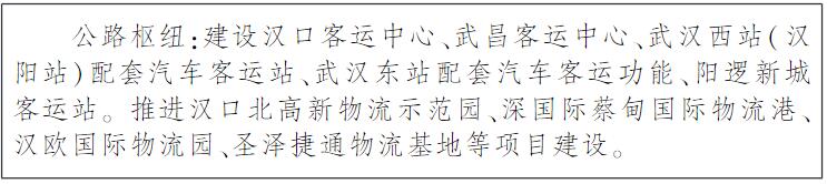 5.建设公路综合交通枢纽。统筹城际铁路、长途客运、旅游客运等客运枢纽建设,完善枢纽配套公路客运功能,加强枢纽之间通道衔接。加快汉口、武昌客运中心建设,探索站城一体化发展新模式,通过上盖建筑等形式实施综合商业开发,实现与城市空间、土地利用、产业布局有机融合。建设武汉集装箱公路中转中心、汉欧国际物流园等一批公路货运枢纽、综合物流园区,发挥公路交通枢纽对港口型、陆港型、空港型、生产服务型、商贸服务型国家物流枢纽支撑作用,促进枢纽经济发展。加快完善全市物流空间格局,打造“四港四轴三集群“四港”:阳逻国际港、吴家山铁路基地、武汉天河机场、鄂州花湖机场;