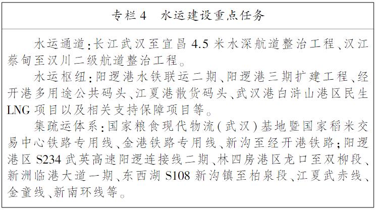 2.完善港口基础设施建设。聚焦港口型国家物流枢纽建设,调整优化集装箱、商品汽车运输、石油化工品、综合服务保障类码头设施功能布局,打造武汉港“一核心三支撑九港区”“一核心”指阳逻港区,“三支撑”指经开港区、白浒山港区、江夏港区,“九港区”是指武汉港的组成港区,包括阳逻港区、经开港区、白浒山港区、江夏港区、主城港区、青山港区、林四房港区、蔡甸港区、东西湖港区。总体格局,加快阳逻和江夏、白浒山、经开港“1+3”集装箱港口群基础设施建设,实施阳逻港三期后续工程等项目,申报水铁联运二期工程外贸集装箱运输资质,谋划水铁联运三期工程。完善阳逻港各作业区联通道路,实现港区配套及口岸功能提升,打造阳逻港多式联运示范区。推进金口港区铁路专用线、新南环线、新洲临港大道等疏港铁路、公路建设,谋划实施新沟至经开港疏港铁路和阳逻港空轨智能集装箱运输系统,形成高效对接、互联互通的港口集疏运体系。