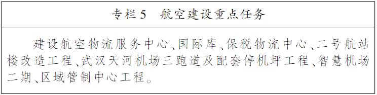 2.大力建设武汉临空经济区。推进国家级临空经济示范区(天河航空城)建设,在武汉天河机场周边布局功能齐全、集约连片的设施集群。提升航空运力及机场地面服务能力,完善区域对外交通网络,打造集空运、科技、医疗健康、商务会展等高端生产性服务业功能于一体的国际开放门户和航空都市。