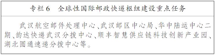 2.建设国内国际运输邮路。依托武汉发达的公路干线网、武汉天河机场和鄂州花湖机场航线网、中欧班列(武汉)和高铁网、长江等运输通道,做强公路邮路、做精航空邮路、做大铁路邮路、做实水运邮路,畅通国内国际邮路运输通道,形成通达广泛、互联高效的邮政快递网。完善城乡公共寄递末端网络,持续推进“邮政在乡”“快递进村”工程,实现行政村快递网点全覆盖。聚焦重点国家,完善日韩、东南亚、俄罗斯等周边区域国际邮路通道,逐步打通面向西欧、中东、美洲、非洲、大洋洲等远程区域寄递邮路通道,推动建设服务稳定的国际网络。