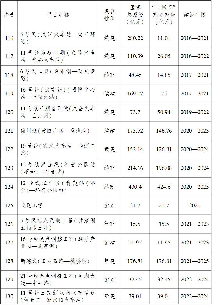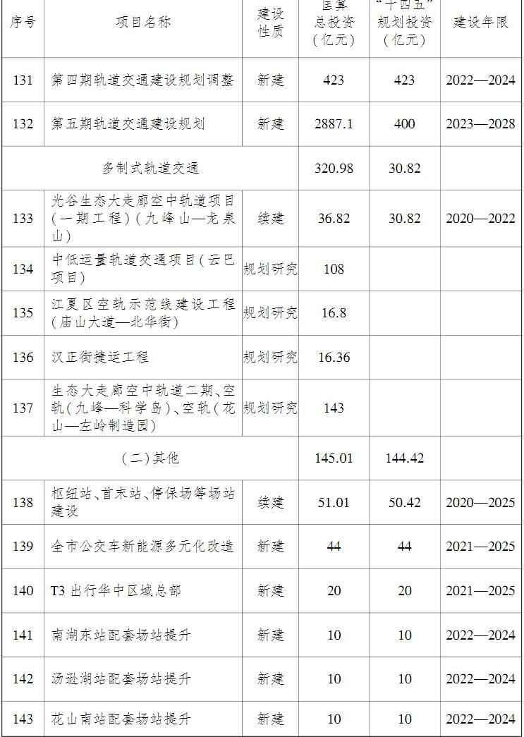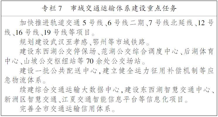 1.打造“轨道上的武汉”。加快多层次轨道交通建设,实施第四期和四期调整、启动第五期轨道交通建设规划,打造主城联网、新城通达的快速通勤走廊,形成总长约700公里的城市轨道交通网络。加快建设7号线北延线、12号线、19号线等一批轨道交通项目,推进在建、已批市域快线项目实施。规划建设武汉站—武汉天河机场、桃桥湖—邾城及武汉至孝感、鄂州等周边地区市域(郊)铁路,探索市域(郊)列车公交化运营,促进城市轨道交通与干线铁路、城际铁路、市域(郊)铁路“四网融合”。