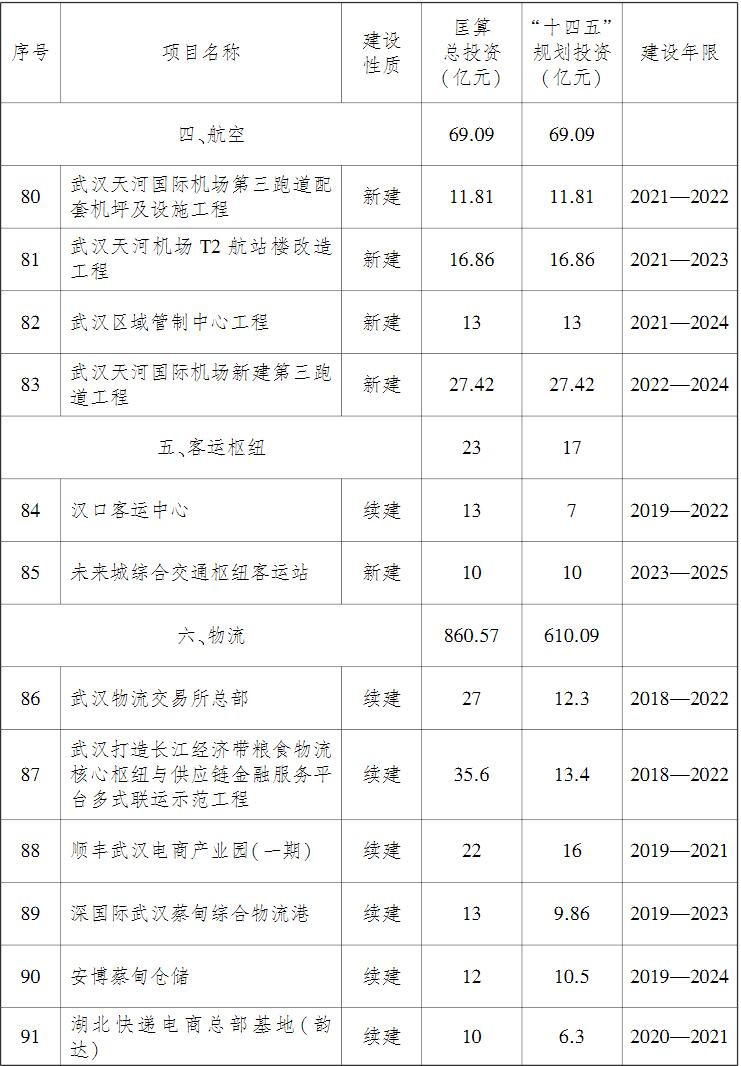 1.提升武汉天河机场国际门户枢纽地位。实施武汉天河机场扩容工程,建设第三跑道、谋划第四跑道。探索武汉天河机场与中心城区之间快速联通方式,将其打造成为快速衔接高铁和城市交通的大型国际航空门户枢纽。完善机场内部货运区道路建设及机场周边路网配套设施,积极布局建设城市货站,提高机场地面集散效率和服务质量。加快完善汉南通用航空机场基础设施建设,拓展客运功能。
