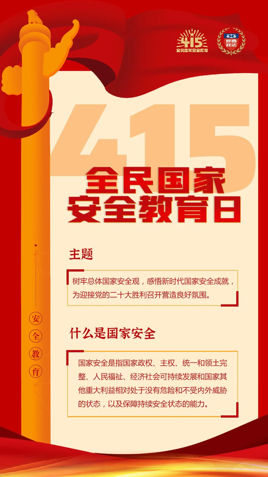 2022年4月15日是第7个全民国家安全教育日,主题是:树牢总体国家安全观,感悟新时代国家安全成就,为迎接党的二十大胜利召开营造良好氛围。