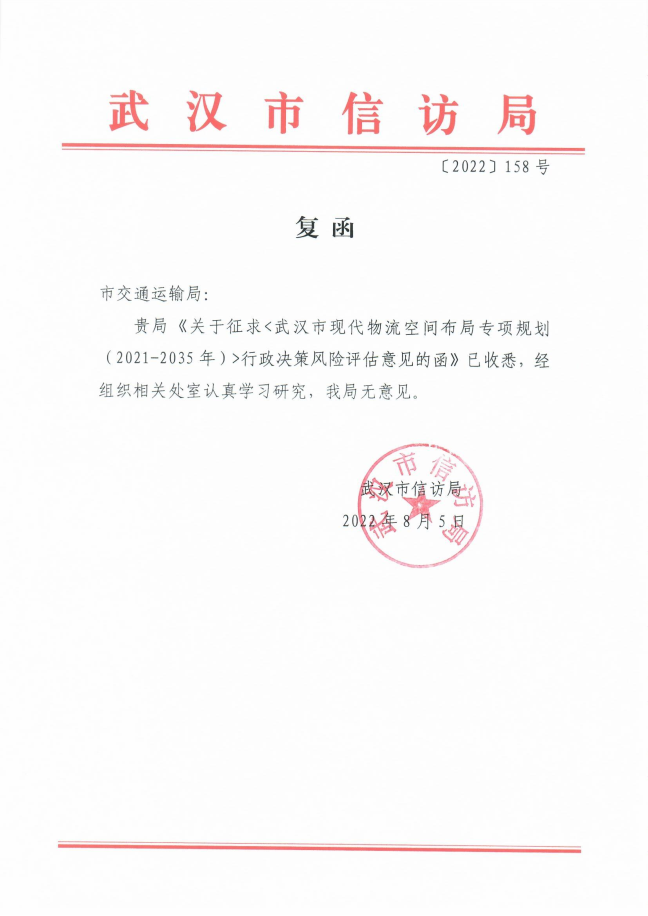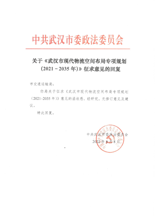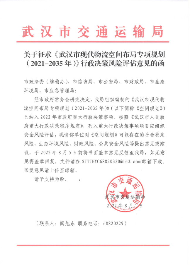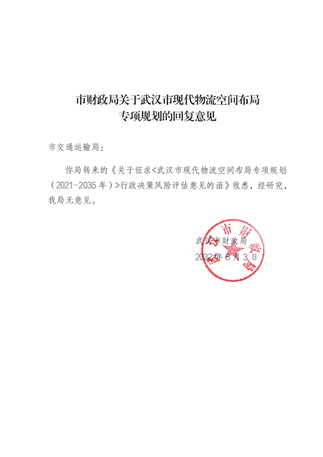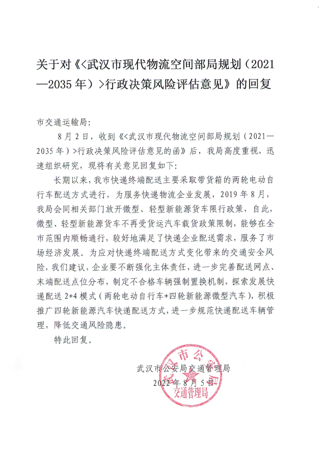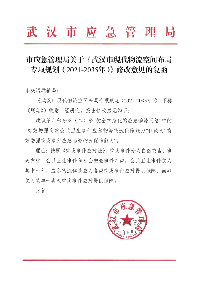 我局经分析和论证认为,《规划》的编制有利于武汉市加快构建以国家物流枢纽为核心的现代化物流运行体系,推动现代物流产业战略升级,有利于支撑国家商贸物流中心建设,助力武汉经济社会高质量发展。本规划风险可控,应予以实施。