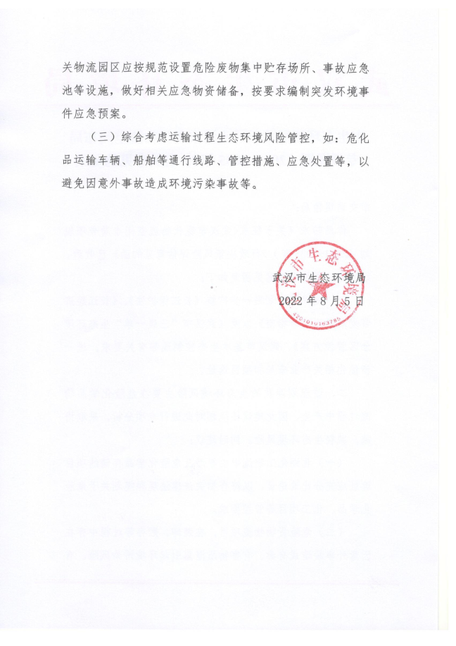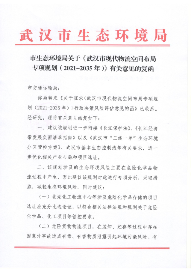 市生态环境局提出,建议该规划进一步衔接《长江保护法》、《长江经济带发展负面清单指南》以及《武汉市“三线一单”生态环境分区管控方案》、武汉市基本生态控制线等有关要求,进一步优化相关产业布局和项目选址。该规划涉及的生态环境风险主要在危险化学品物流过程中产生,因此建议该规划对此进行专项分析,采取措施,减轻生态环境风险,同时建议,北湖化工物流中心等涉及危险化学品存储的项目选址应充分比选论证,以符合相关法律法规和规划关于危险化学品、化工项目等管控要求;危险货物物流项目,在装卸、贮存等过程中存在因意外事故造成有毒、有害物质泄露引起环境污染风险。有关物流园区应按规范设置危险废物集中贮存场所、事故应急池等设施,做好相关应急物资储备,按要求编制突发环境事件应急预案;综合考虑运输过程生态环境风险管控,如:危化品运输车辆、船舶等通行线路、管控措施、应急处置等,以避免因意外事故造成环境污染事故等。