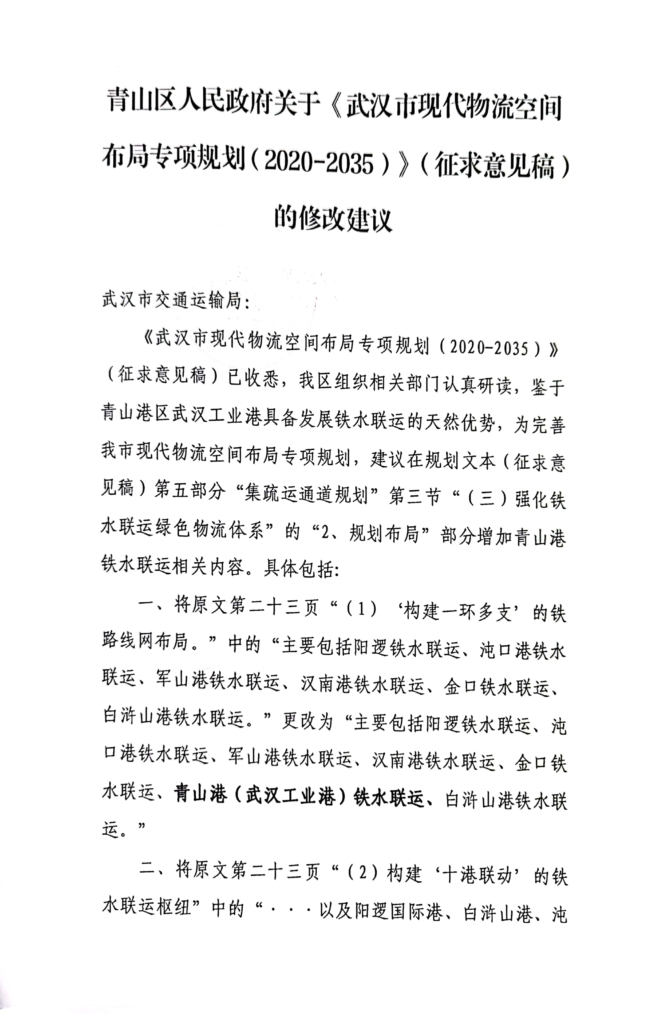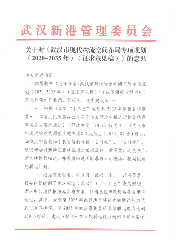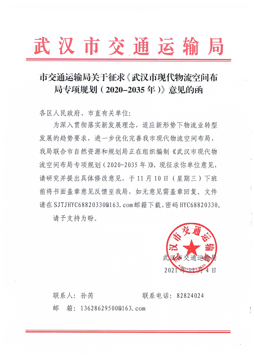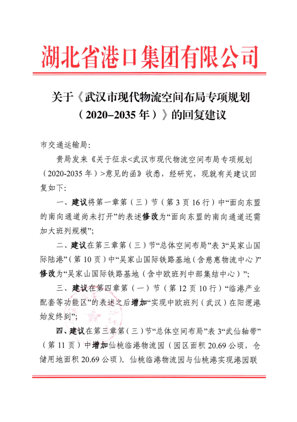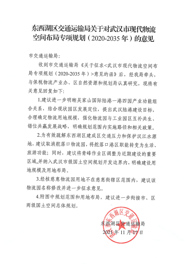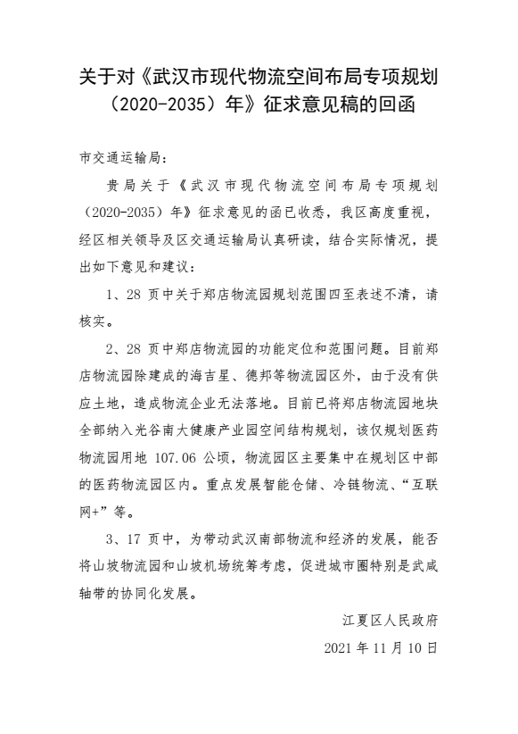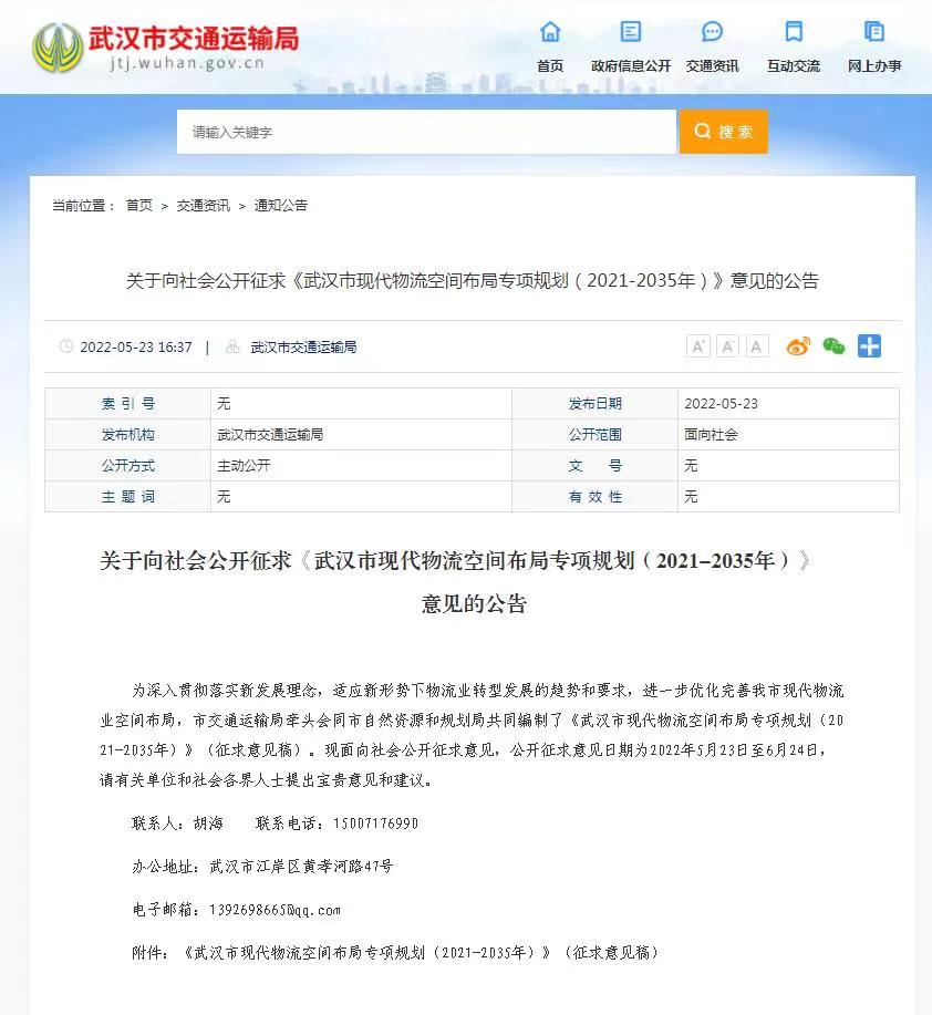 按照武汉市有关规划编制进度安排,市交通运输局牵头编制的《武汉市现代物流空间布局专项规划(2021-2035年)》(征求意见稿),于2022年5月23日至6月24日向社会公开征求意见,现将具体意见情况汇总如下。现将具体意见情况汇总如下