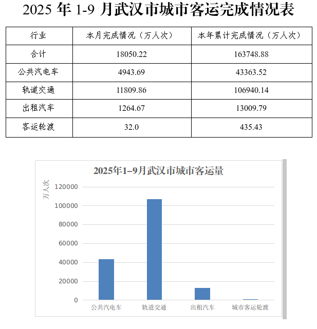 1-9月,全市城市客运量完成163748.88万人次。分方式看,公共汽电车客运量完成43363.52万人次;轨道交通客运量完成106940.14万人次;巡游出租车客运量完成13009.79万人次;客运轮渡客运量完成435.43万人次。